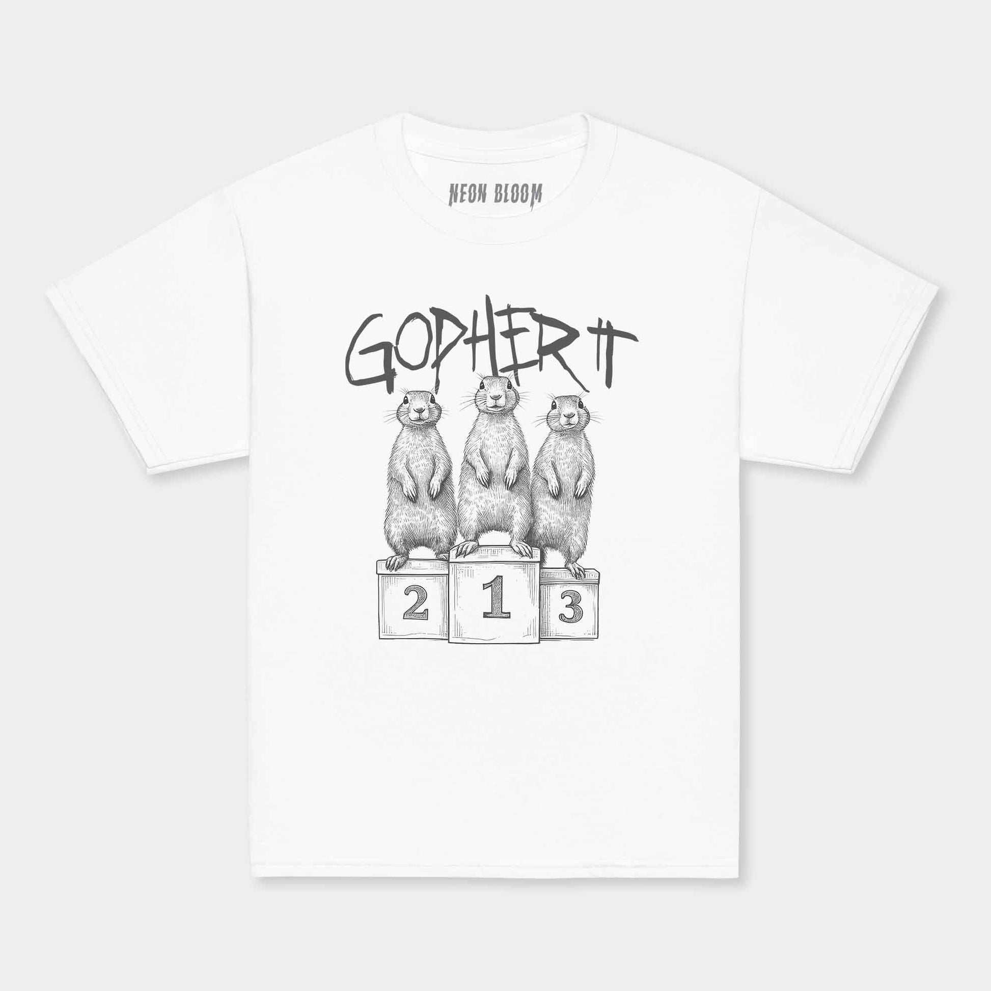 This kids tee features three gophers on pedestals with the phrase, "Gopher It".